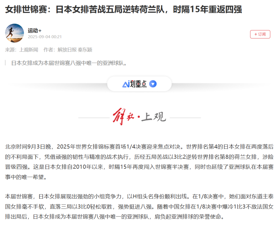 随着中国女排在1/8决赛中以1-3不敌法国队出局,日本女排成为八强中唯一晋级的亚洲代表。我国老牌官报《解放日报》特别指出,“日本女排苦战五局逆转荷兰队,时隔15年重返四强。”、“日本女排成为本届世锦赛八强中唯一的亚洲球队,肩负起亚洲排球的荣誉使命。”